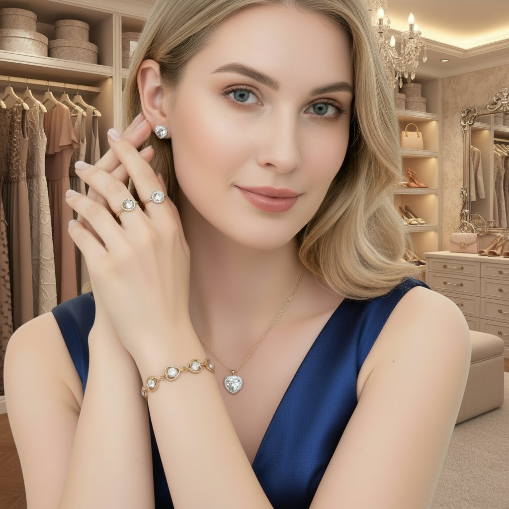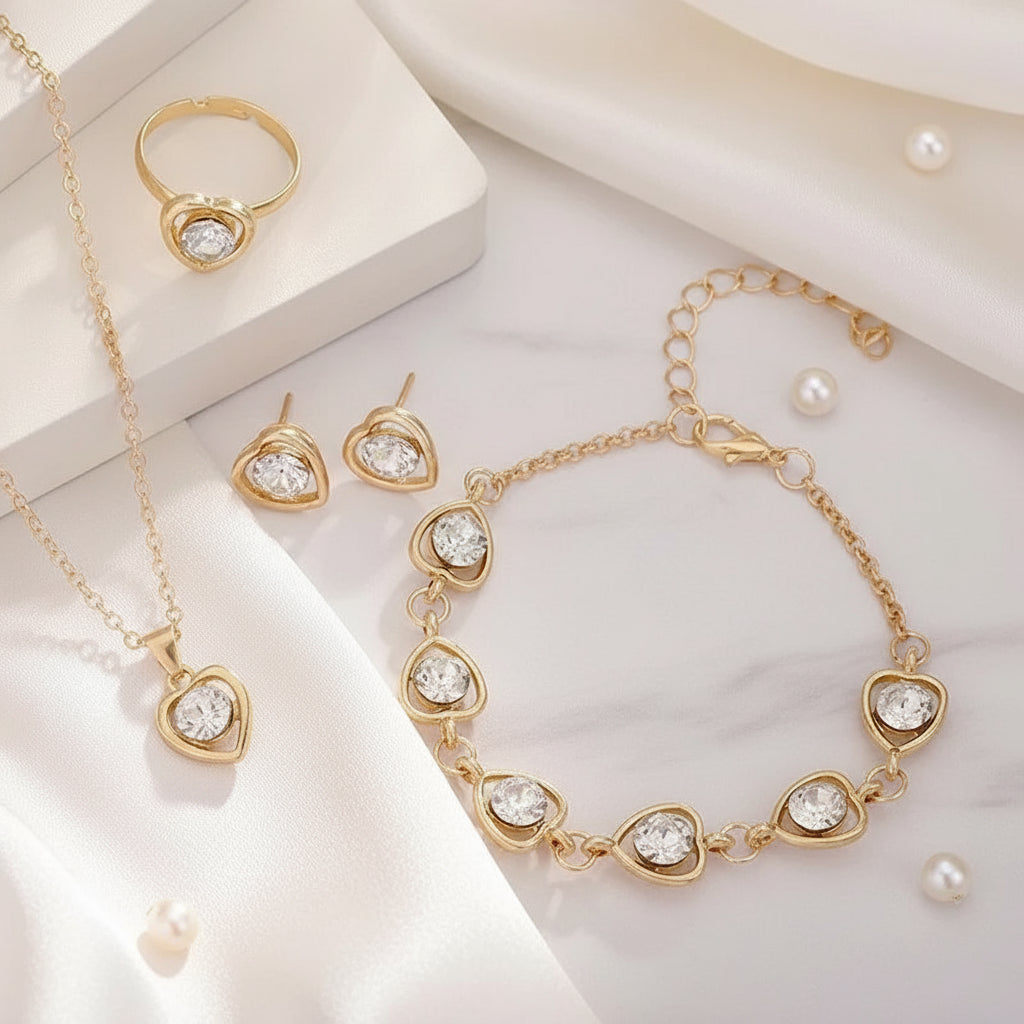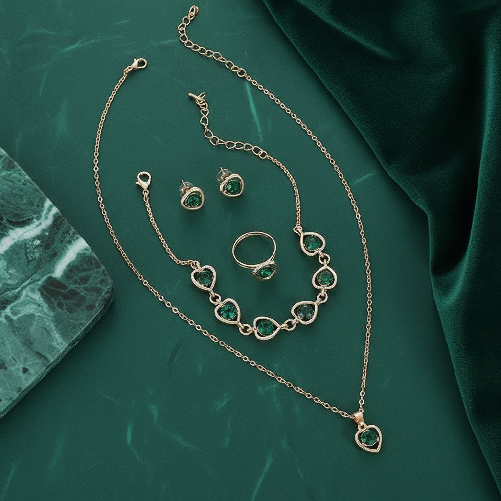 Laissez-vous séduire par l'élégance intemporelle de l'ensemble Le Cœur De KT. Ce somptueux set de bijoux, inspiré par la passion et le raffinement, capture la lumière dans ses pierres d'un vert émeraude profond. Chaque pièce — le collier délicat, le bracelet articulé, la bague éblouissante et les boucles d'oreilles discrètes — est ornée d'un motif cœur, symbole d'un amour pur et éternel. Le plaqué or, chaleureux et lumineux, contraste magnifiquement avec la richesse du vert, faisant de cet ensemble le cadeau parfait ou l'accessoire indispensable pour illuminer vos moments les plus précieux.