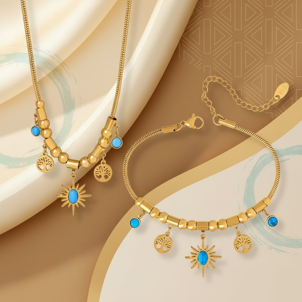Laissez-vous guider par l'énergie du Soleil et l'enracinement de l'Arbre de Vie. Cet ensemble harmonieux, en acier inoxydable doré, présente des perles cylindriques et des breloques pleines de sens. Les accents de pierre bleue éclatante rappellent le ciel clair et confèrent une touche de sérénité. Un duo rayonnant qui allie protection, vitalité et un style bohème-chic intemporel.