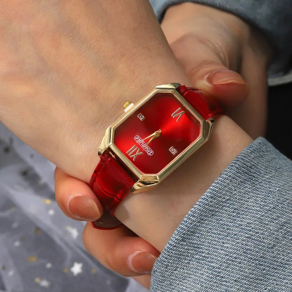 Le design de cette montre est une célébration de la géométrie et de la sophistication. Le boîtier, d'une forme rectangulaire distinctive avec ses bords facettés (octogonaux), est magnifié par une riche finition dorée. C'est un accessoire audacieux, parfait pour le bureau comme pour une soirée mondaine.