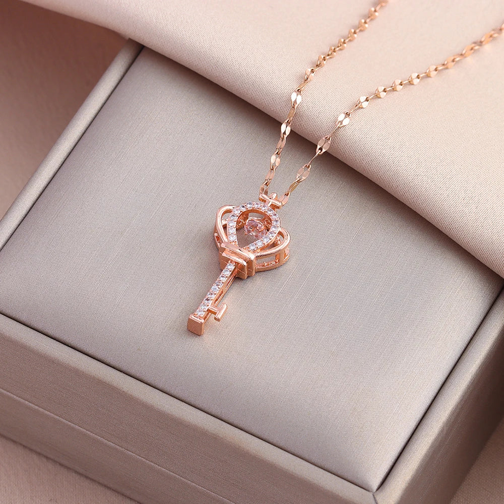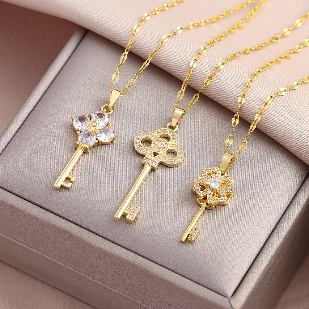 Ces pendentifs sont bien plus que de simples bijoux : ils sont la clé de votre histoire. Chaque modèle, en finition dorée éclatante, présente une tête de clé ornementée de fleurs ou de cœurs incrustés de micro-cristaux. Ils symbolisent l'ouverture des possibilités, la sagesse et l'accès à un nouveau chapitre. Portez-en un comme un rappel de votre propre potentiel, ou offrez-le comme la clé d'un secret partagé et précieux.