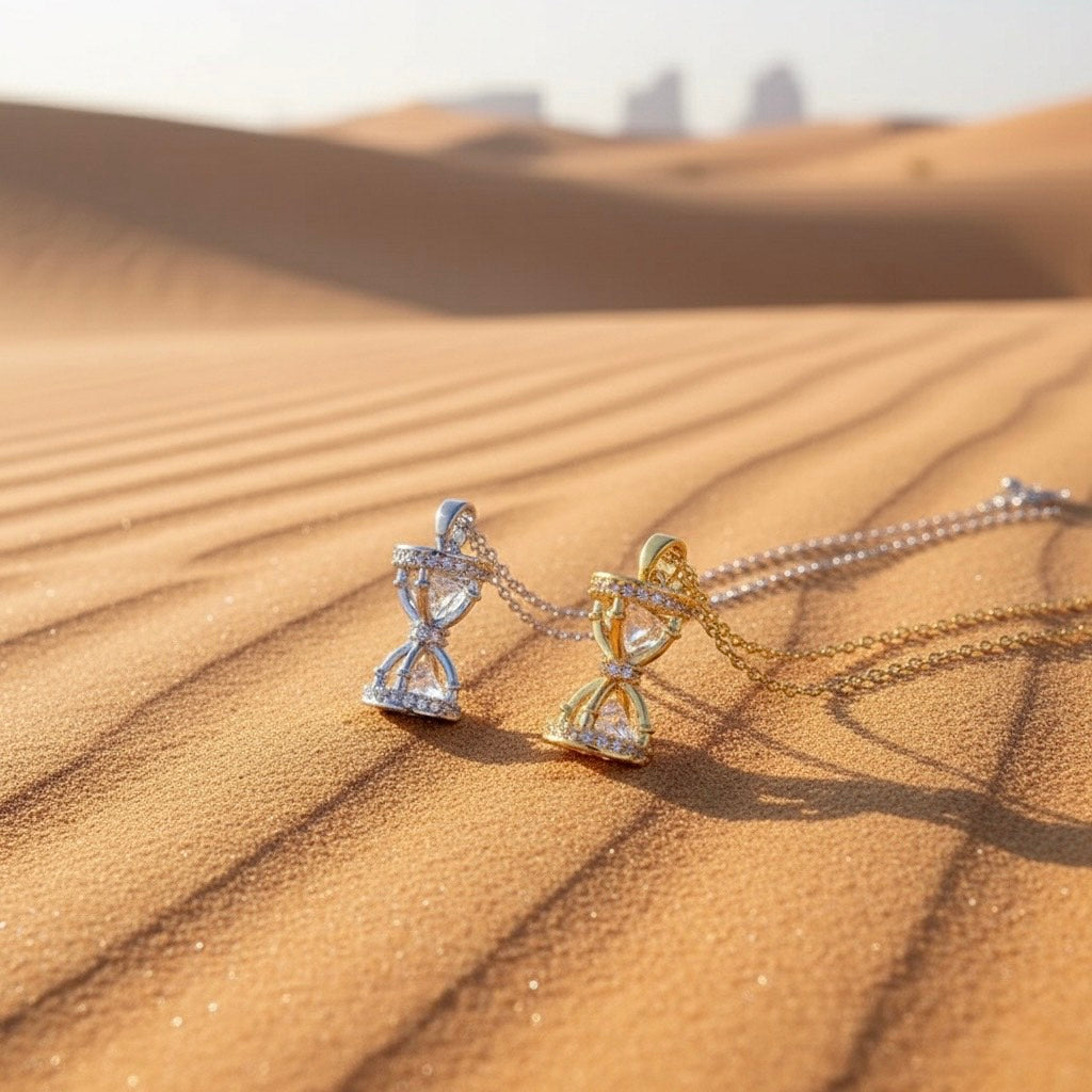 Ce pendentif est une ode à l'importance de chaque instant. Le design du sablier, finement ciselé et serti de cristaux scintillants, est une métaphore du temps qui passe, rappelant qu'il faut chérir le moment présent. La "matière" centrale en cristal pur symbolise l'éclat de l'instant capturé. Disponible en or chaleureux ou en argent intemporel, ce collier est le cadeau parfait pour célébrer un anniversaire, une amitié durable, ou pour marquer un moment précieux.